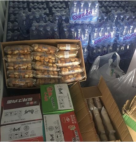 圖為第一批送至災(zāi)區(qū)募捐物資(水、方便面、面包及醫(yī)療儀)